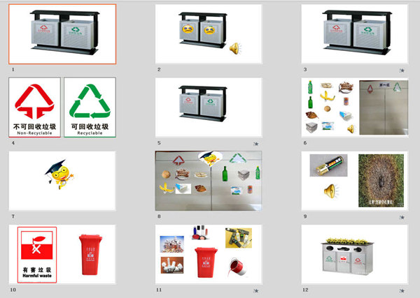 1、认识并理解生活中可回收、不可回收、及有害垃圾的标记。