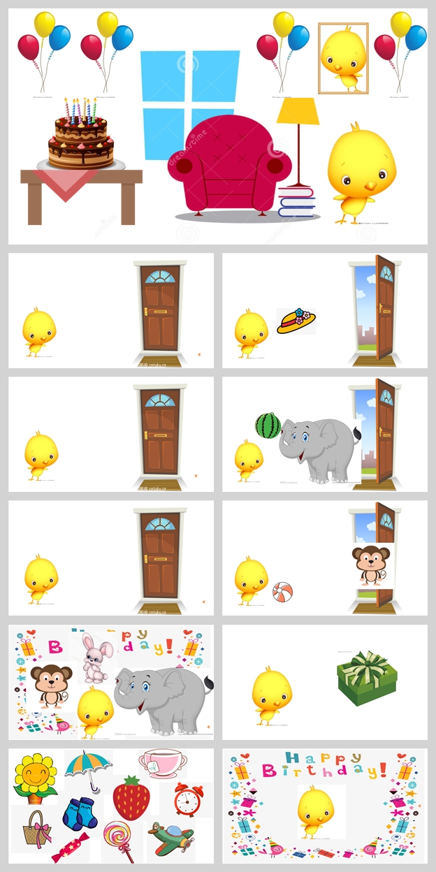 师:小动物们给小鸡送来了各种各样的礼物,它开心极了,于是他们在一起快乐的唱啊跳啊,一起过生日。