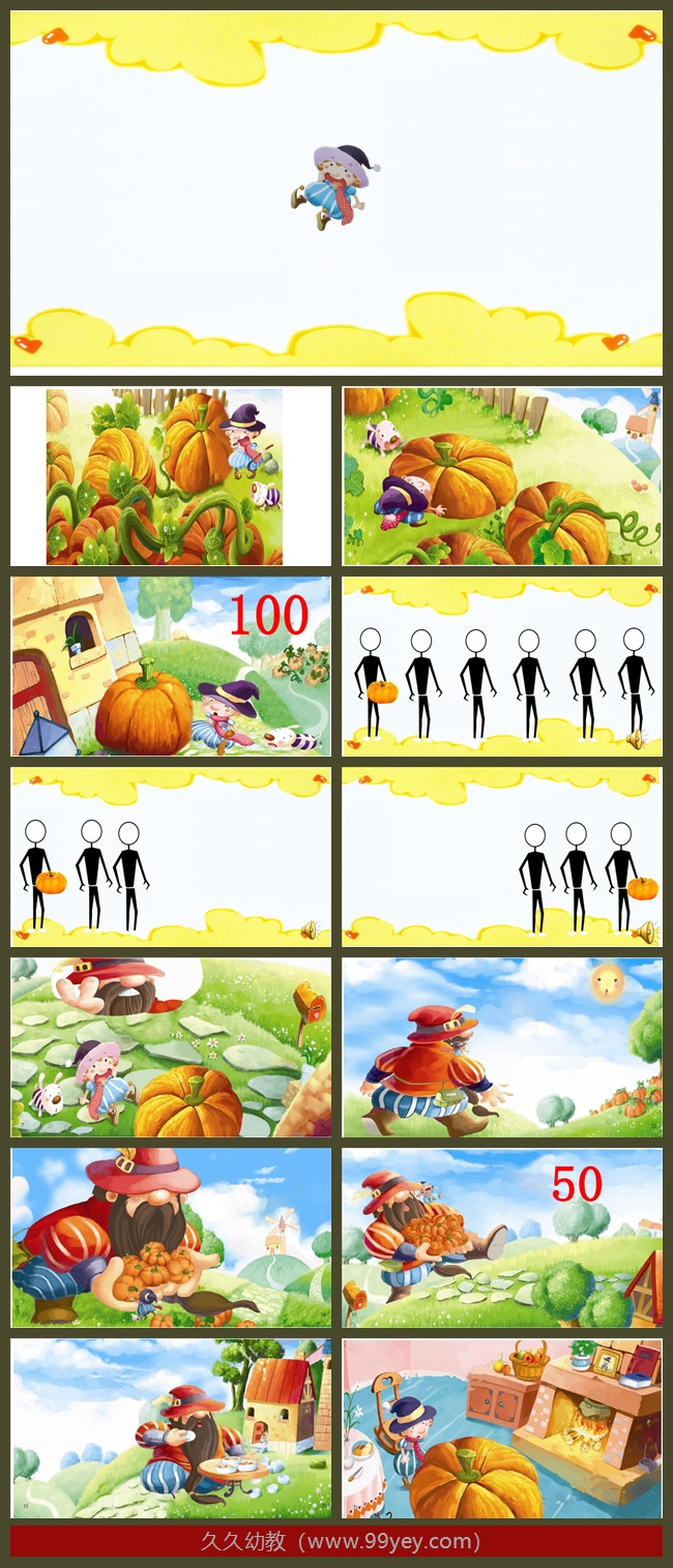 师:小矮人看到大脚巨人说:大脚巨人谢谢你,你一定肚子饿了,我一定要请你吃南瓜,大脚巨人摸着自己的肚子说:嗯嗯谢谢你,我正好肚子饿了,于是小矮人去厨房拿南瓜了,端了一碗又一碗,端了一碗又一碗,大脚巨人一边吃一边说:太好吃了,太好吃了,南瓜怎么这样少了,大脚巨人个子高,吃的也多,你猜猜他吃了多少个南瓜,告诉你们真的让大家大吃一惊,大脚巨人吃了一百个南瓜,那剩下几个南瓜,101个只剩下1个南瓜,小矮人看着这个唯一的唯一的一个南瓜,他想:我辛辛苦苦种了那么多的南瓜,白天浇水施肥捉虫子,到了晚上还不敢睡觉,睡在南瓜地里看护南瓜,不让田鼠和狐狸偷吃南瓜,就这样辛辛苦苦的一年,大脚巨人来帮忙,最后吃的只剩下一个,早知道这样,我还要不要大脚巨人来帮忙。