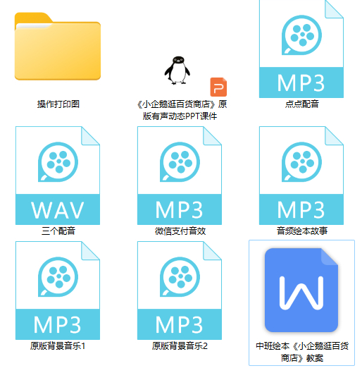 师:今天,企鹅兄弟一起去商场买东西。大哥拿着红色的包,二哥拿着蓝色的包,三哥拿着黄色的包,老四畅畅拿着绿色的包,最小的点点背着一个粉色的包,它们出发了。