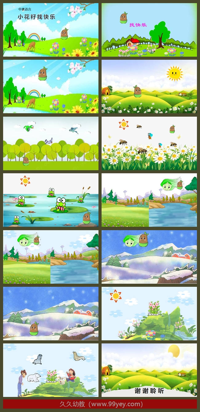 宝贝们,你们瞧,老师给大家带来了一位好朋友,它就是小花籽,让我们先和小花籽问好吧?(幼儿向小花籽问好),今天,小花籽要给大家讲一个关于她去寻找快乐的故事。你们想听吗?