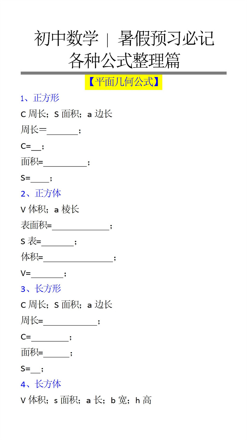 初中数学 暑假预习必记 各种公式整理 初中数学 暑假预习必记 各种公式整理初中数学 暑假预习必记 各种公式整理