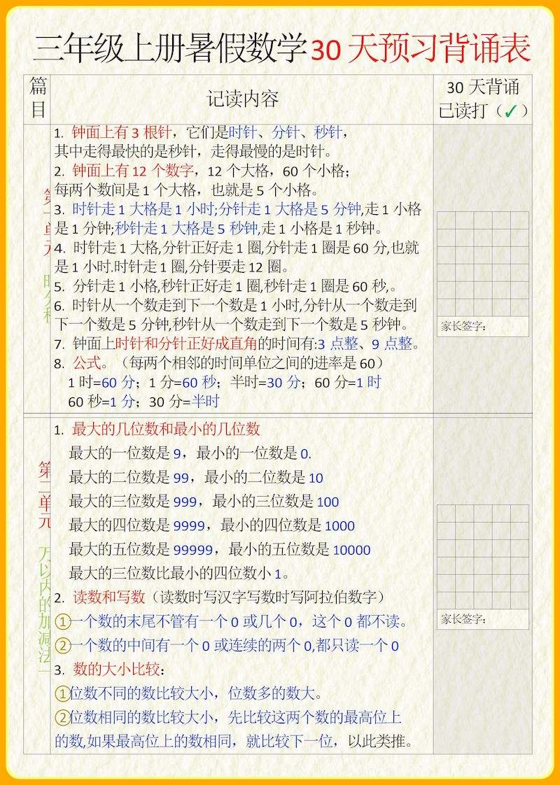 三上暑假数学30天预习背诵表 三上暑假数学30天预习背诵表