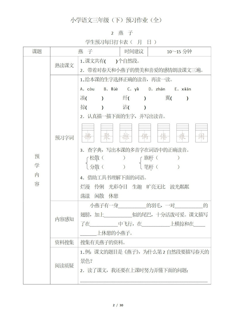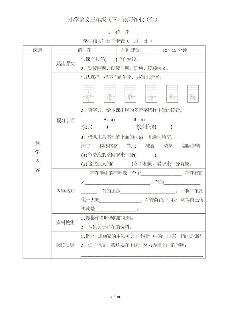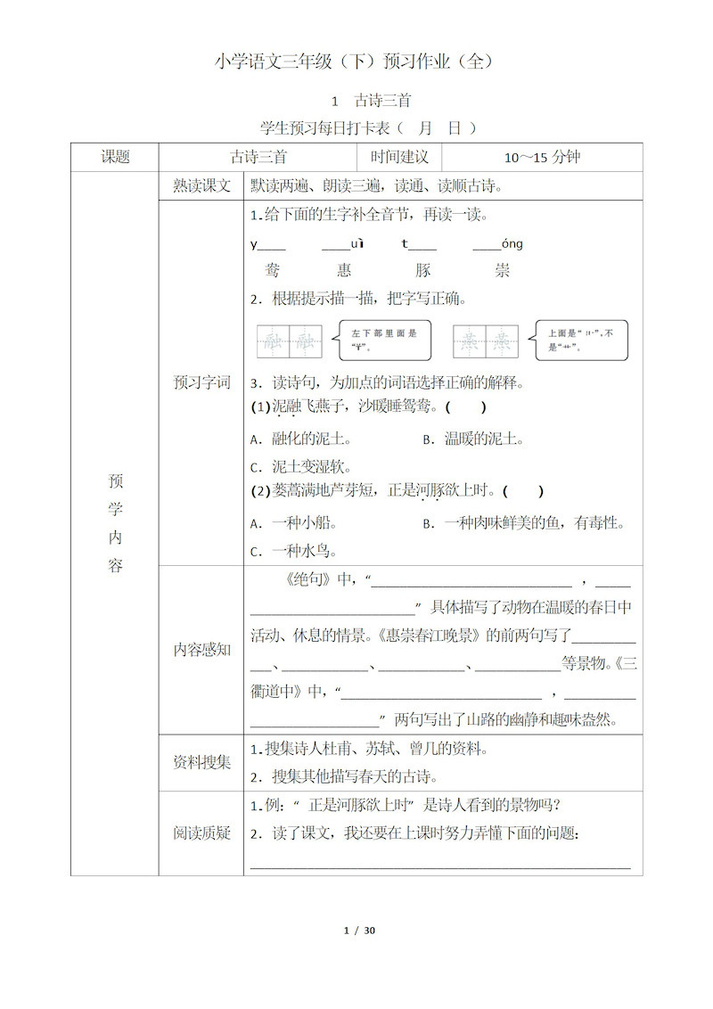 三下语文预习单(无答案) 三下语文预习单(无答案) 三下语文预习单(无答案)