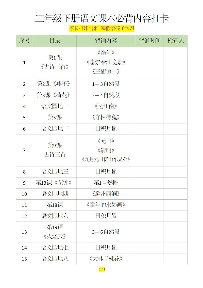 三下语文课本必背内容打卡 三下语文课本必背内容打卡 三下语文课本必背内容打卡