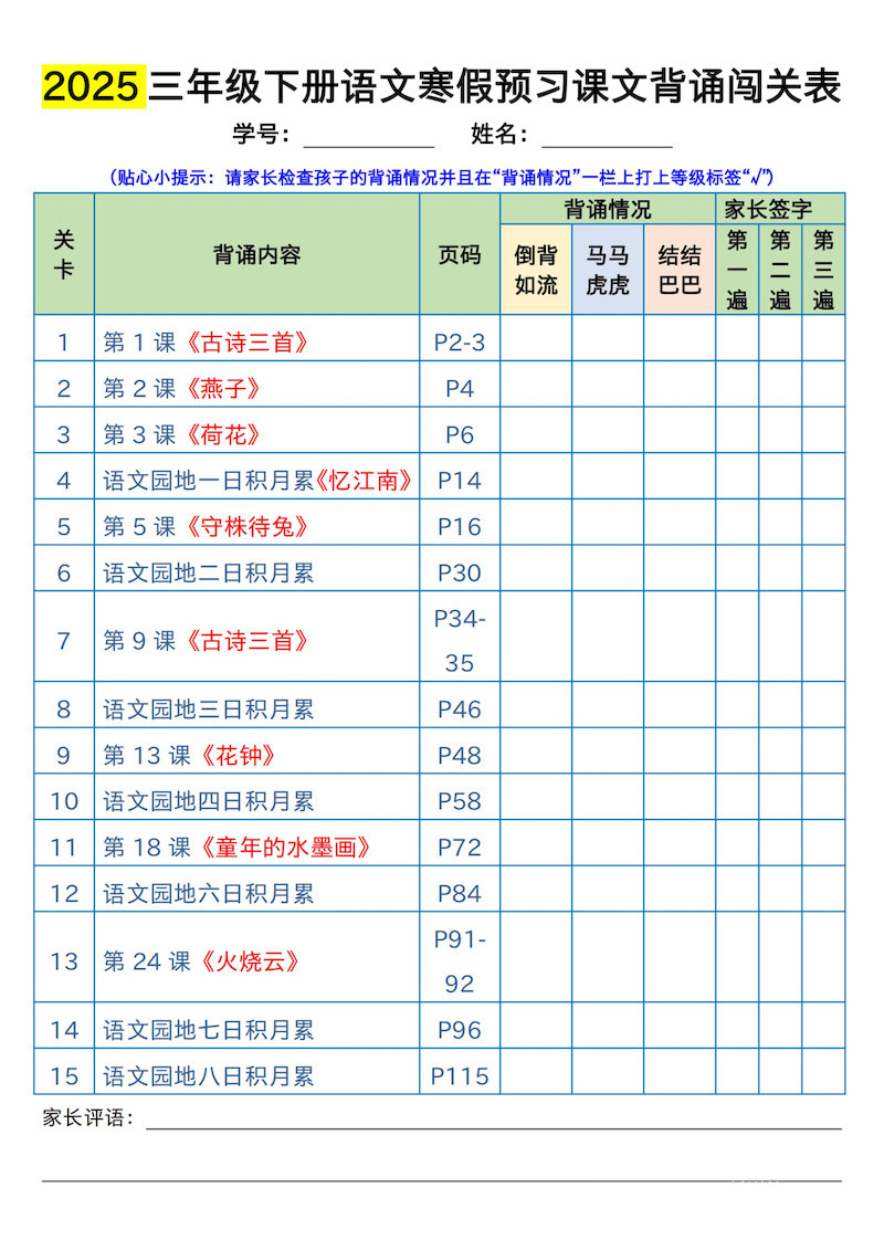 三下语文寒假预习:课文背诵闯关表