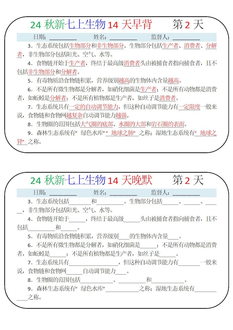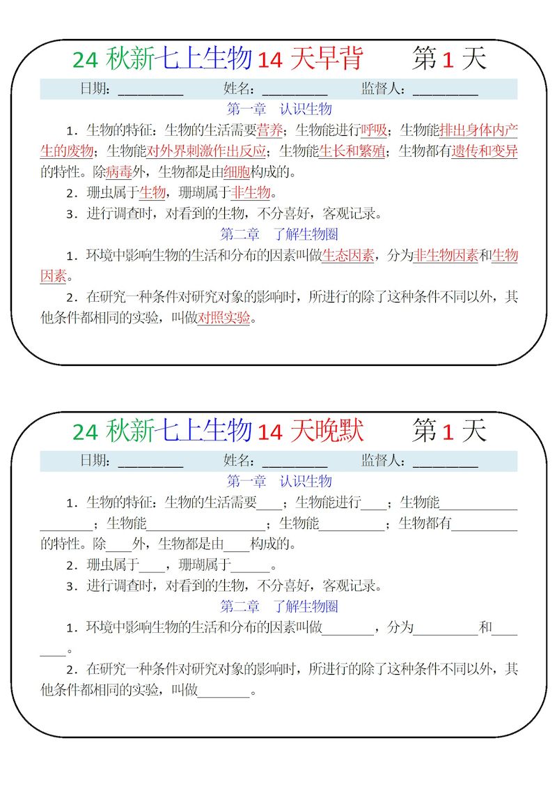 24秋新七上生物14天早背晚默 24秋新七上生物14天早背晚默