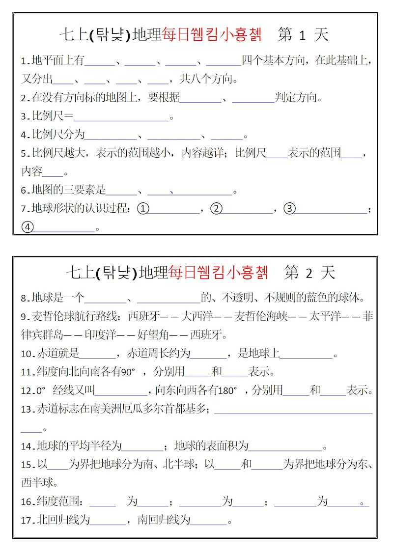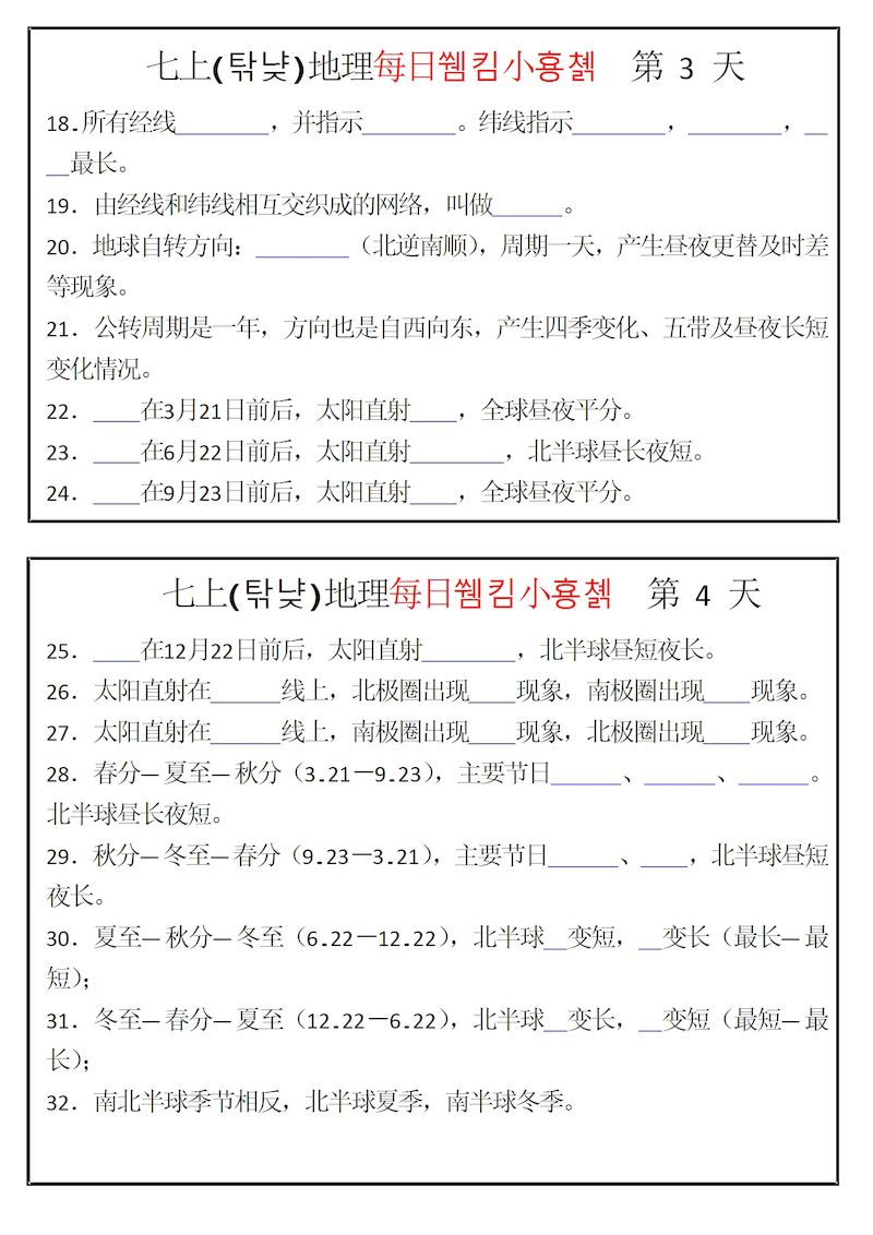【7年级上】地理每日默写小纸条 【7年级上】地理每日默写小纸条