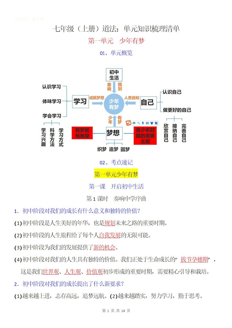 第一单元 少年有梦【单元速记知识清单】-【新教材】 第一单元 少年有梦【单元速记知识清单】-【新教材】