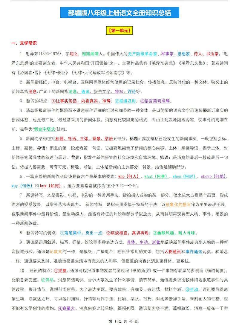 【八上语文】全册知识总结彩色版(部编版) 【八上语文】全册知识总结彩色版(部编版)