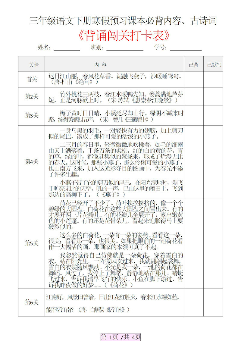 三下语文寒假预习:课本必背内容、古诗词及国学内容《背诵闯关表》