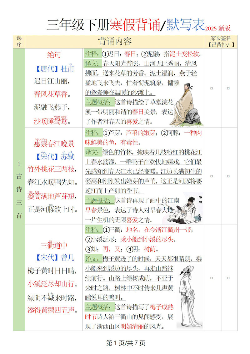 三下语文寒假背诵默写表(含空表) 三下语文寒假背诵默写表(含空表)
