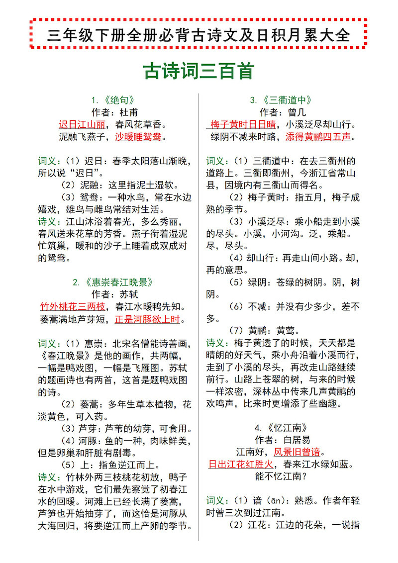【语文寒假预习】全册必背古诗文及日积月累大全三下语文