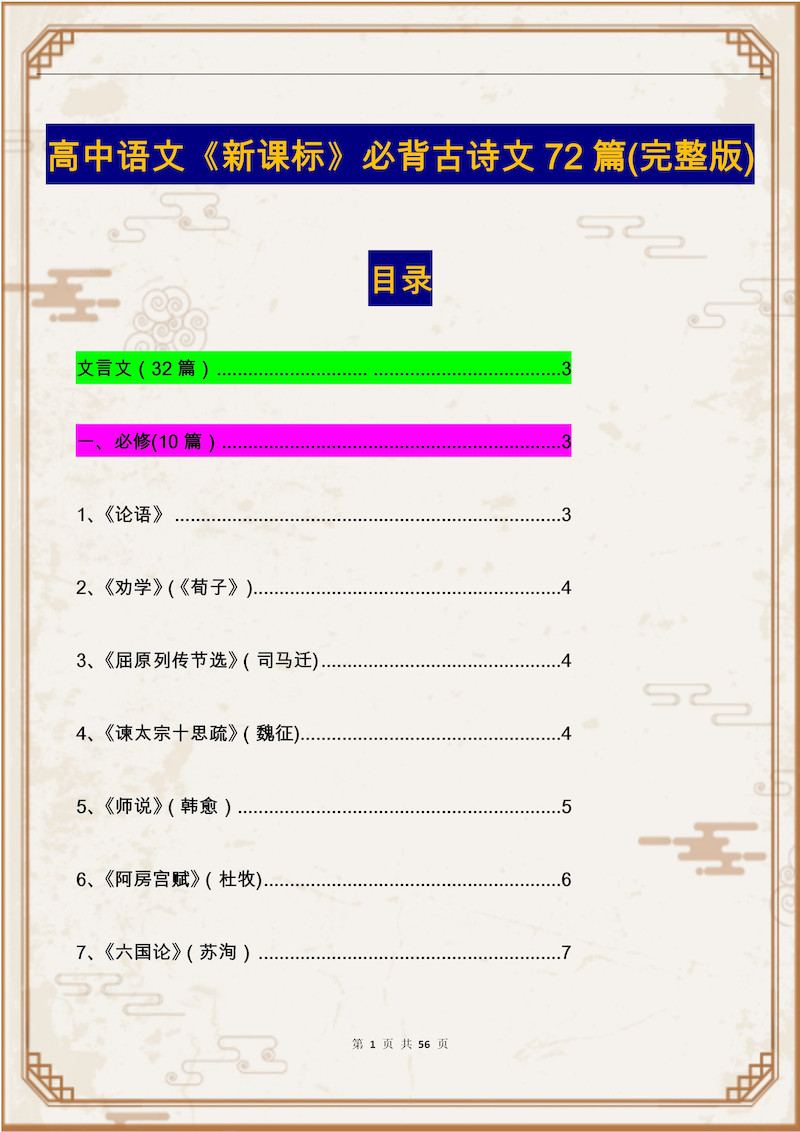 高中语文《新课标》必背古诗文72篇(完整版) 高中语文《新课标》必背古诗文72篇(完整版)