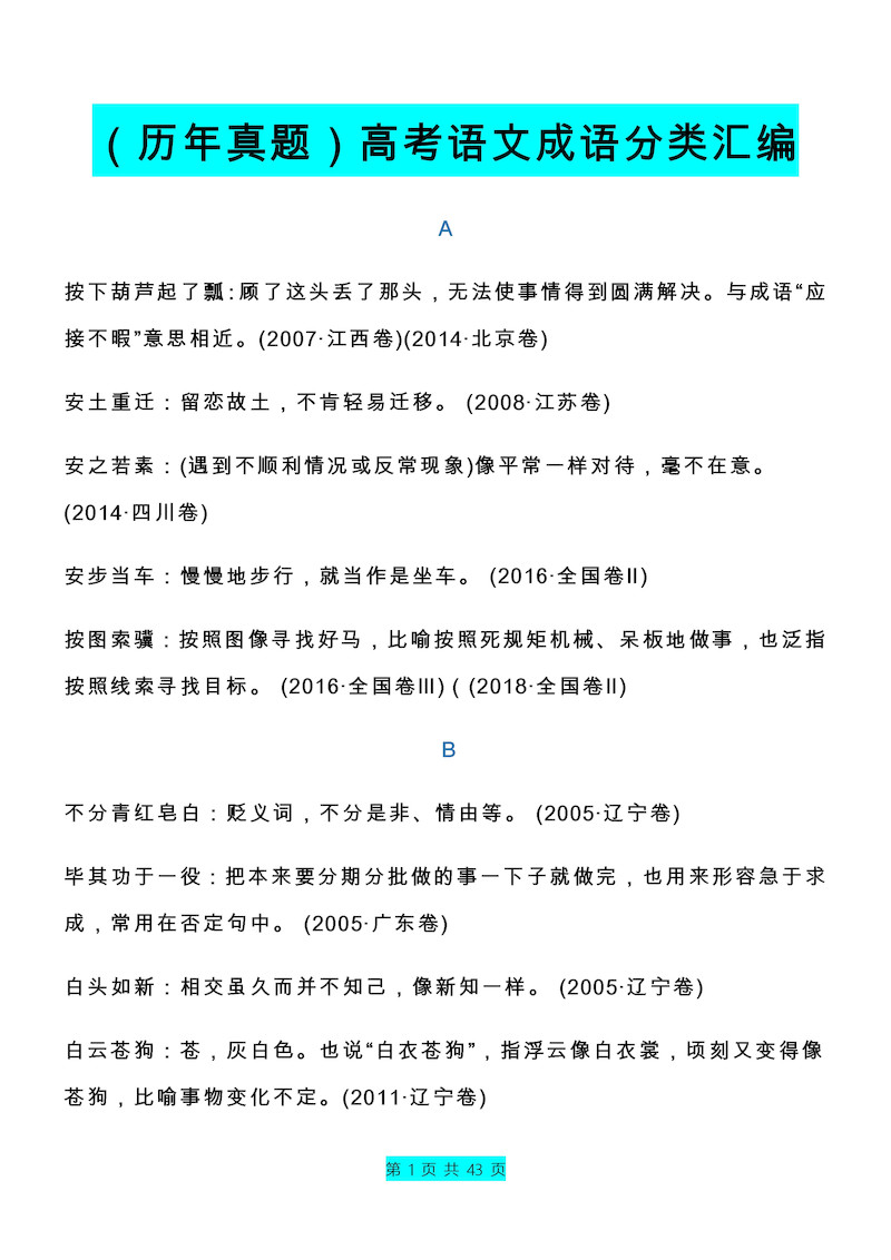 高中语文历年高考真题成语分类汇编 高中语文历年高考真题成语分类汇编