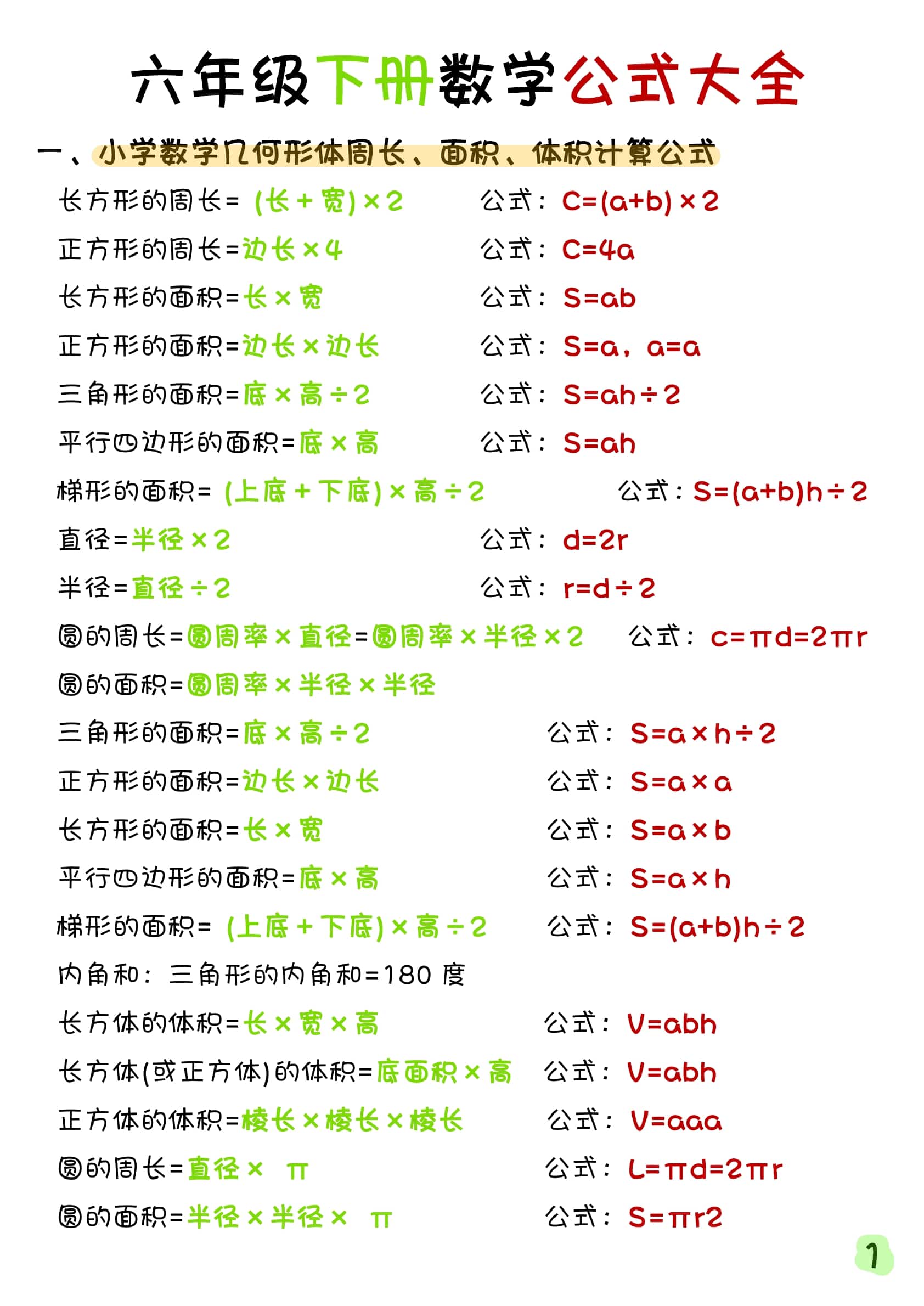 六年级下册数学寒假预习必背重点公式 六年级下册数学寒假预习必背重点公式