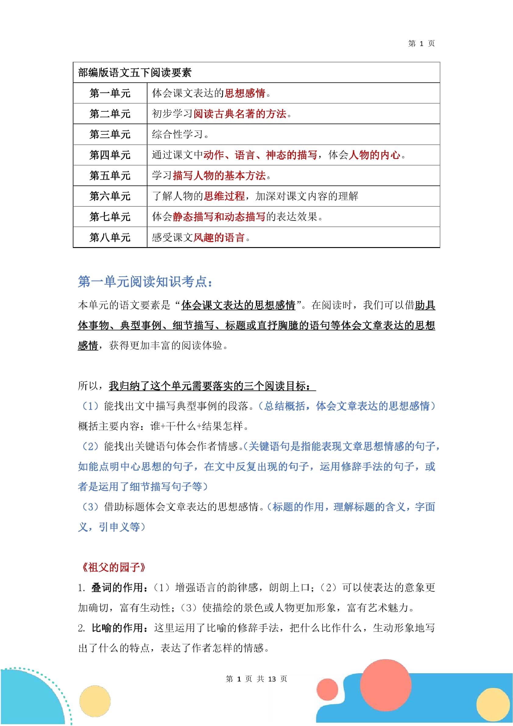 【1-8单元阅读要素(知识考点)】五下语文 【1-8单元阅读要素(知识考点)】五下语文
