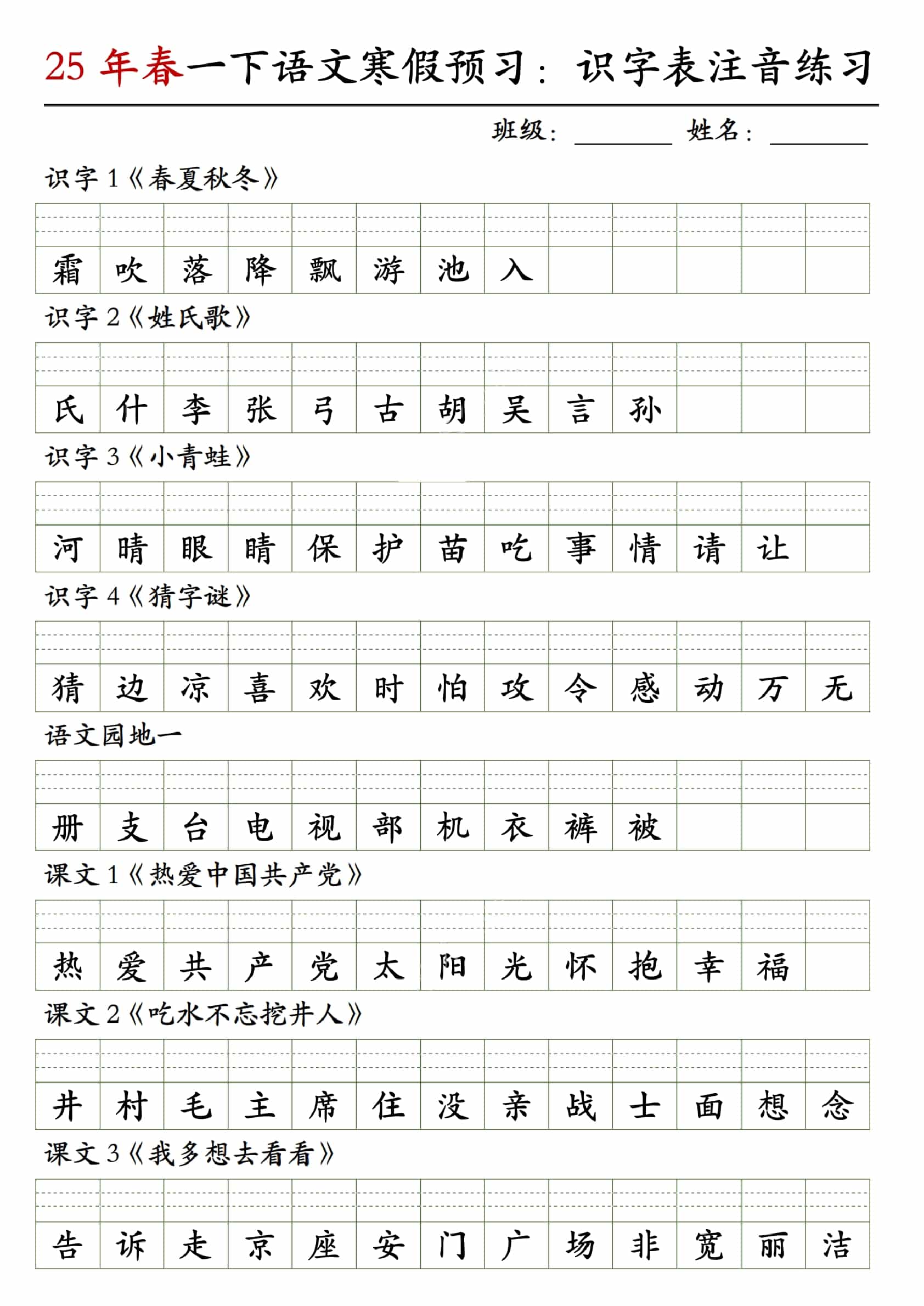 【25年春-识字表注音练习】一下语文