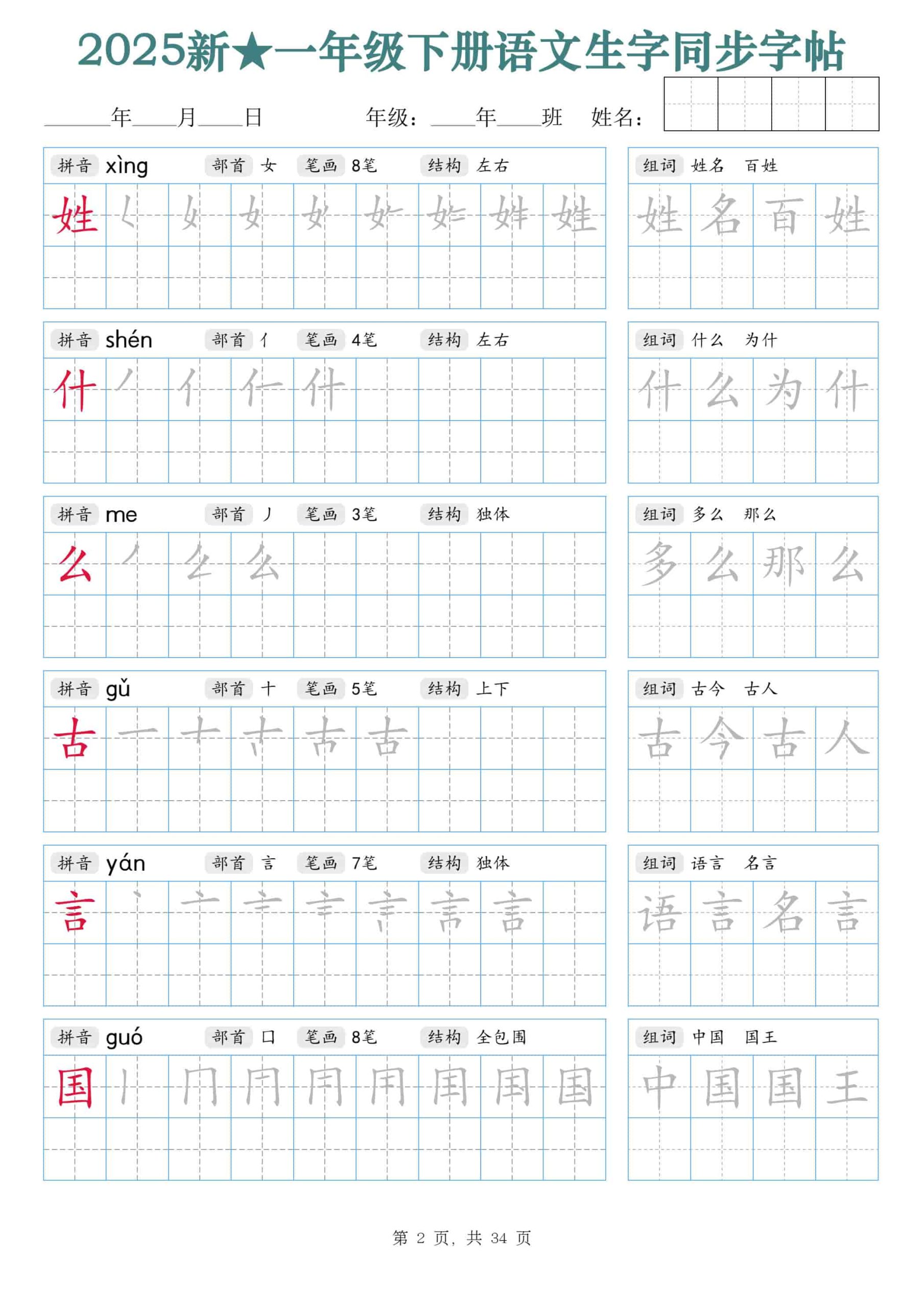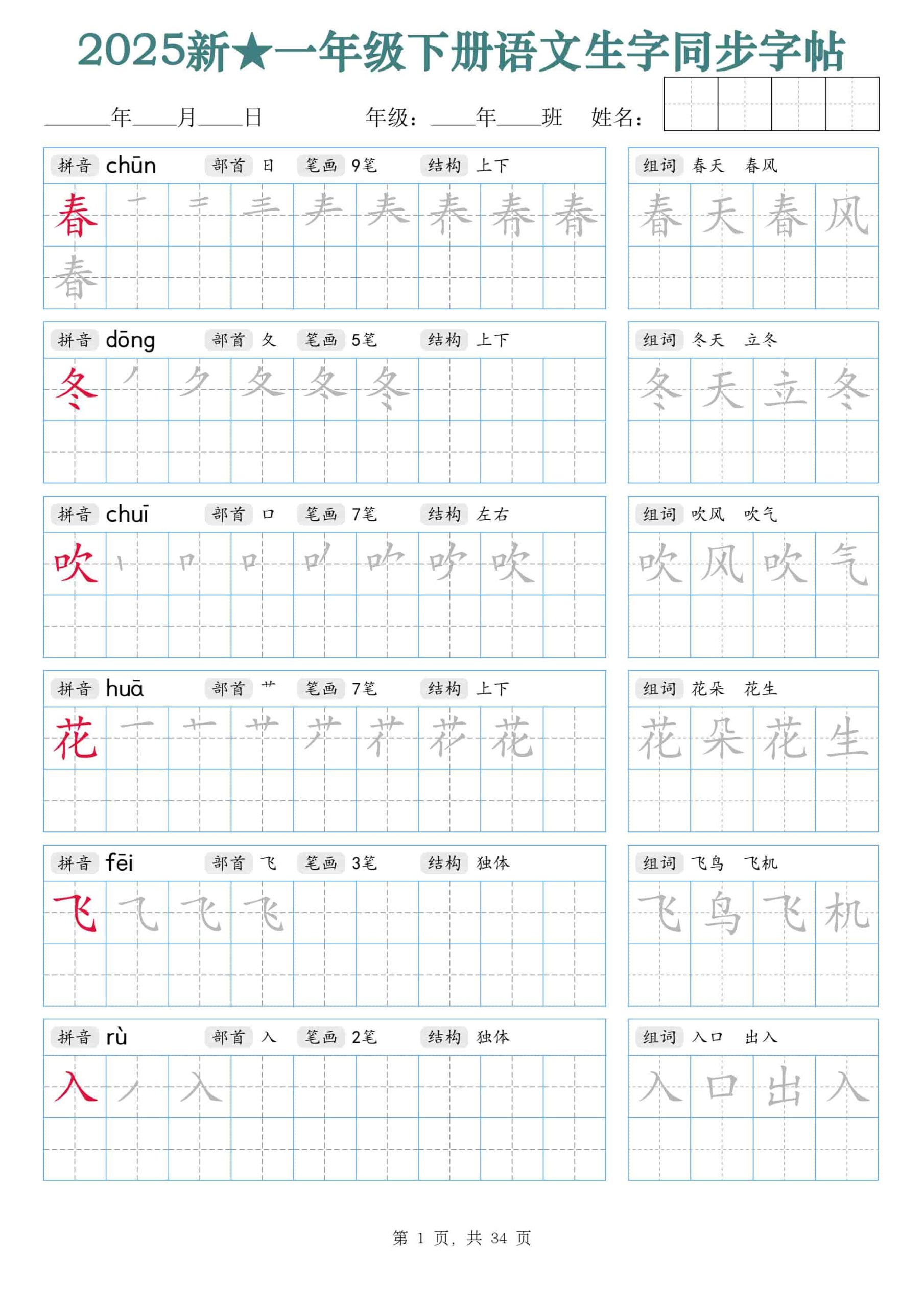 【25新一下语文生字同步字帖(笔顺组词完整34页)拼音部首笔画结构 【25新一下语文生字同步字帖(笔顺组词完整34页)拼音部首笔画结构