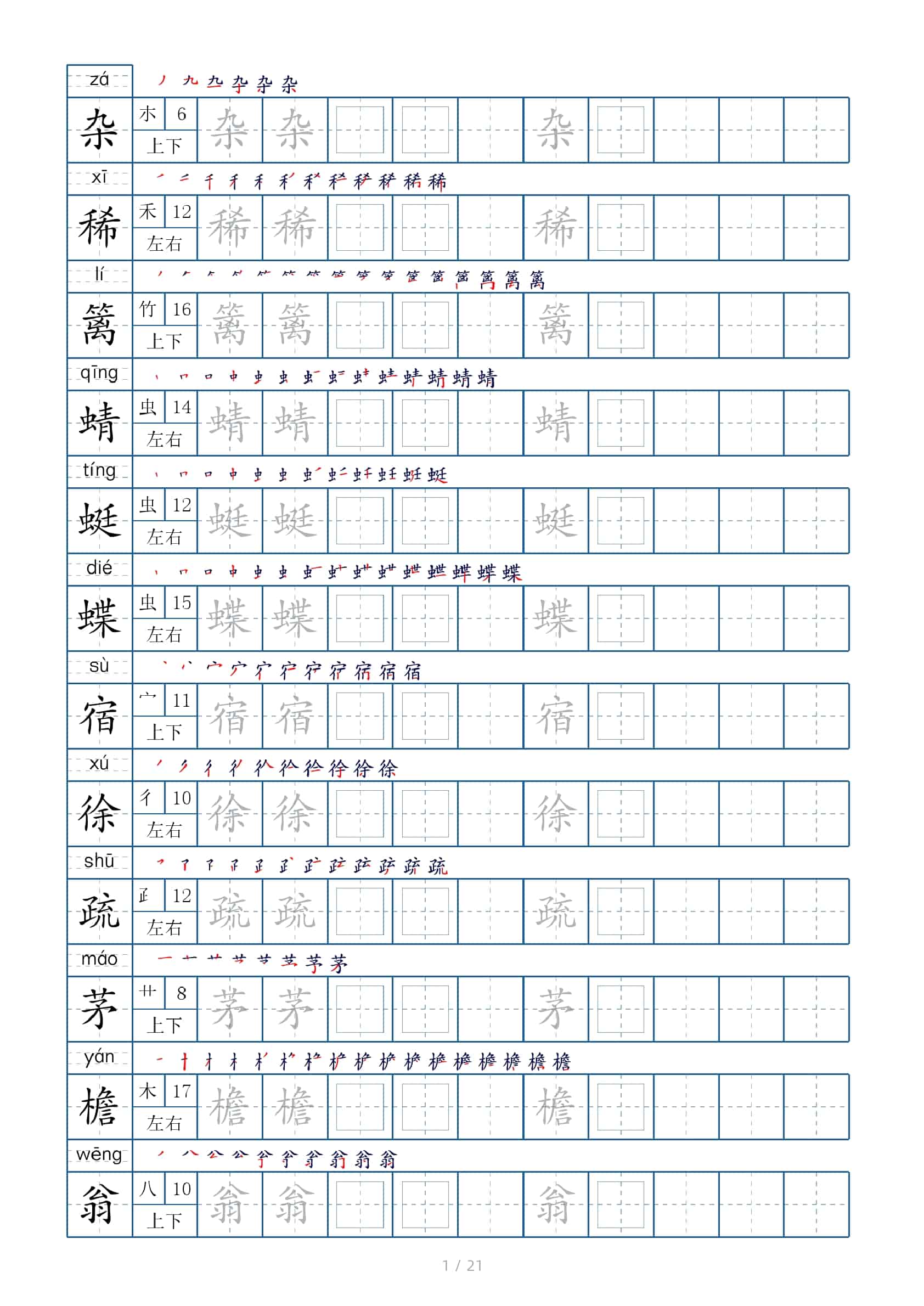 【生字表字帖250个(偏旁部首+笔顺+拼音21页)】四下语文