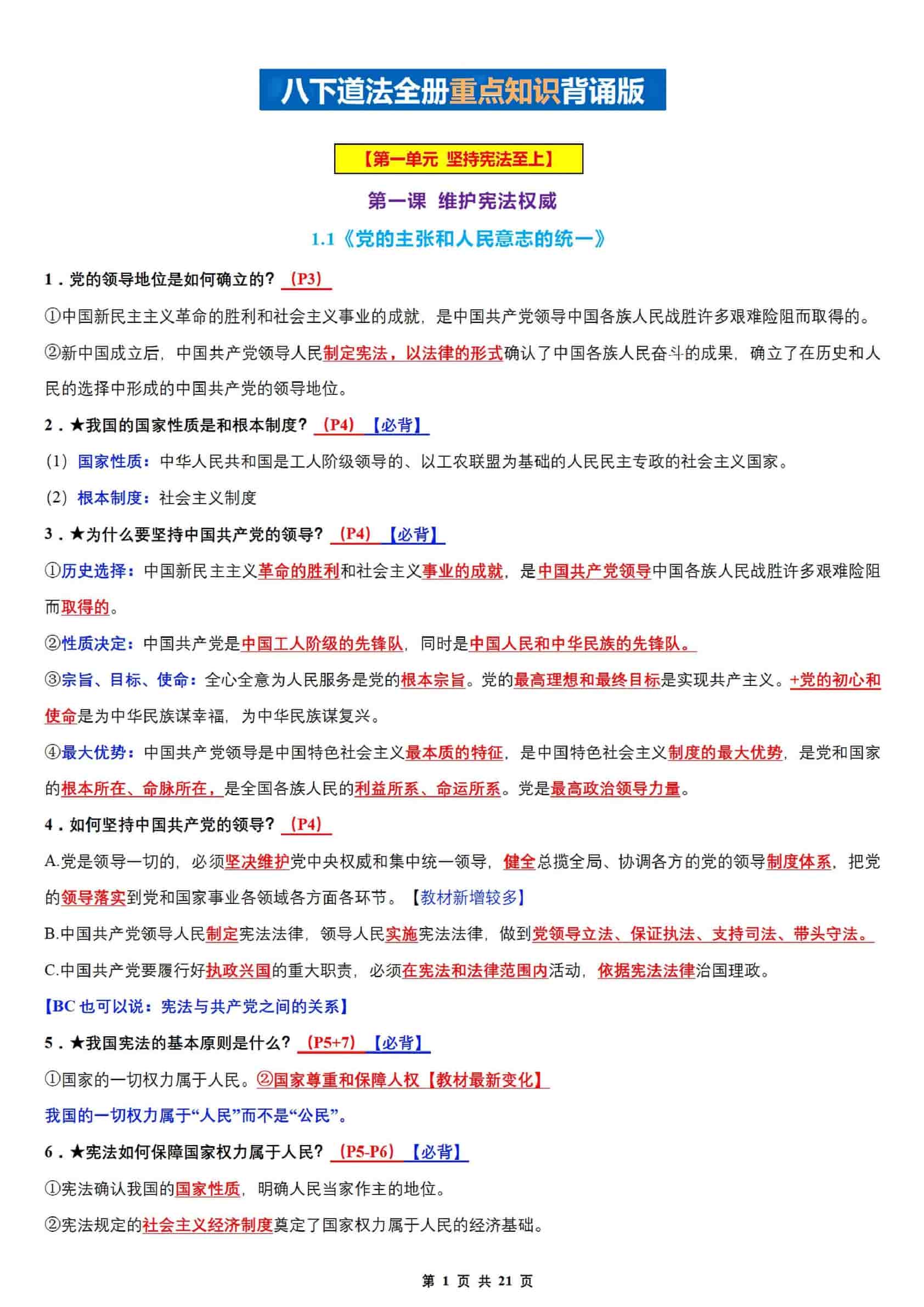 【八下道法】全册重点知识背诵版(部编版) 【八下道法】全册重点知识背诵版(部编版)