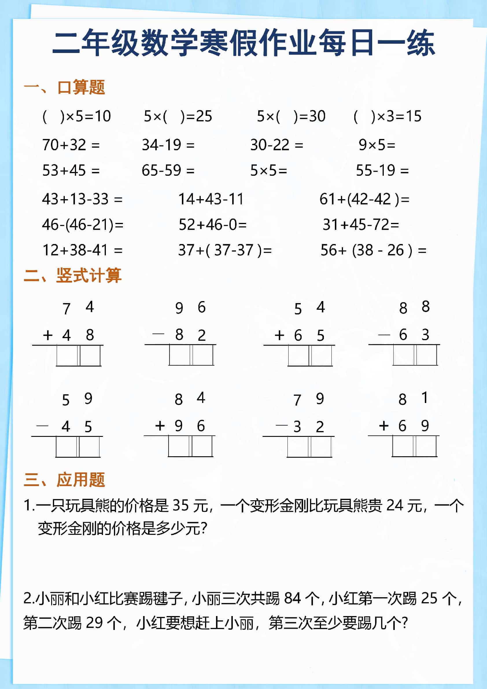 二年级下册数学寒假作业每日一练30天口算竖式应用题(30页)