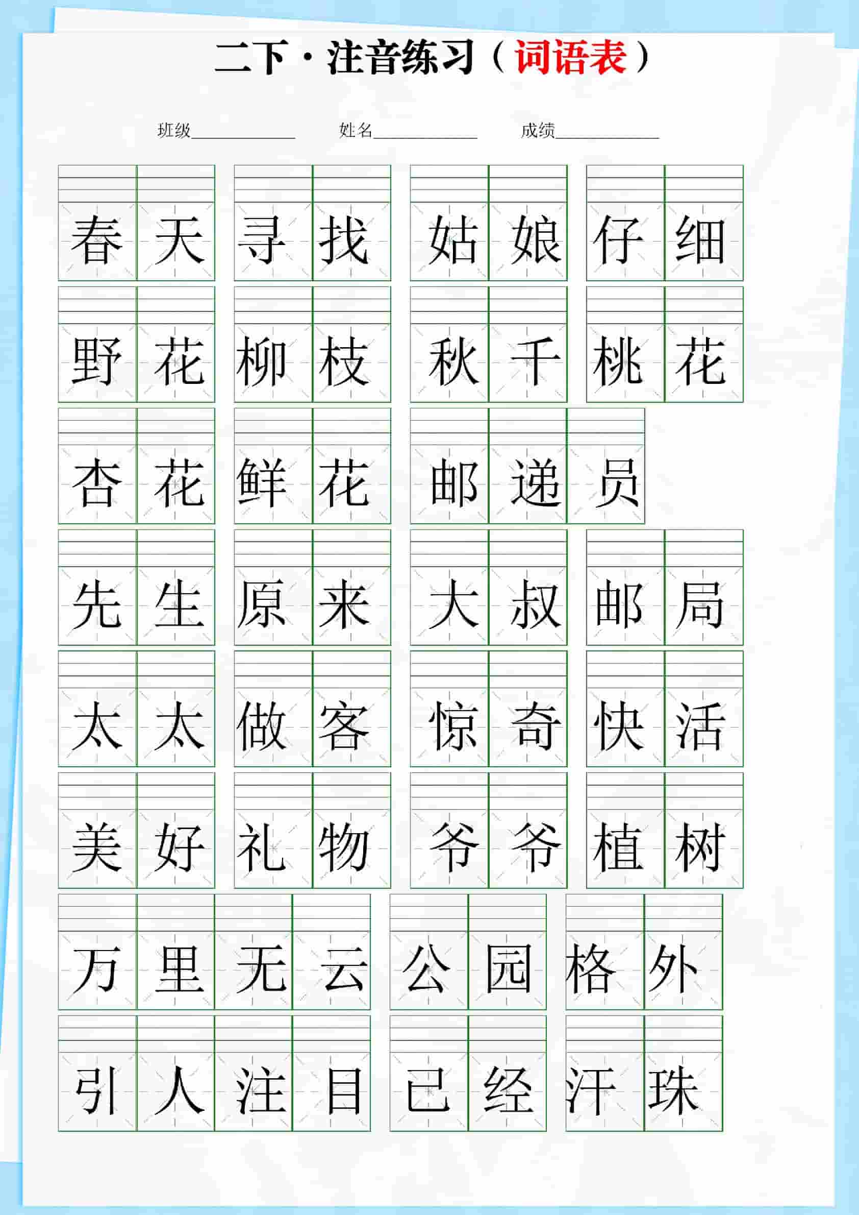 二下语文词语表【注音】练习(含答案18页)