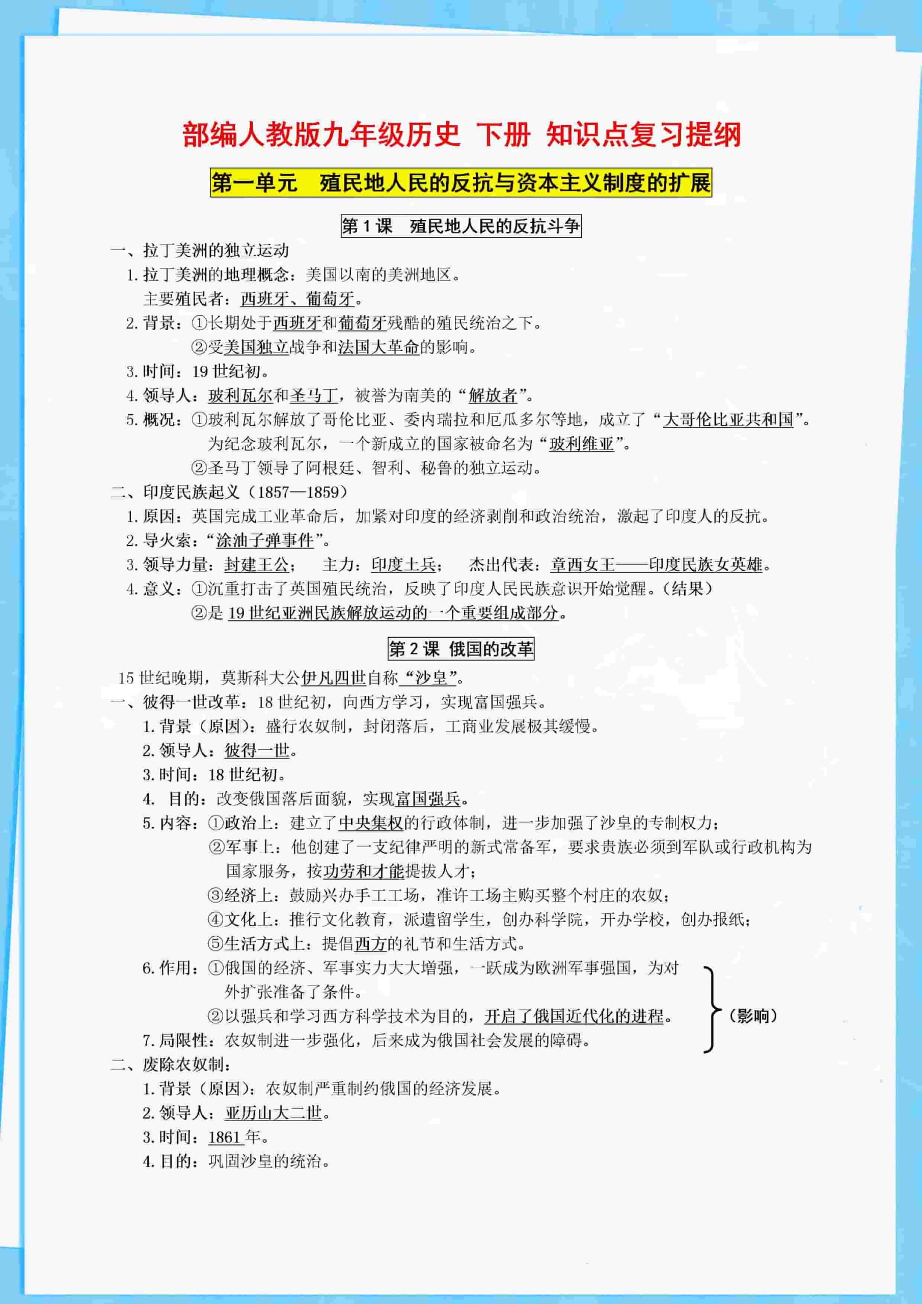 九年级历史下册知识点