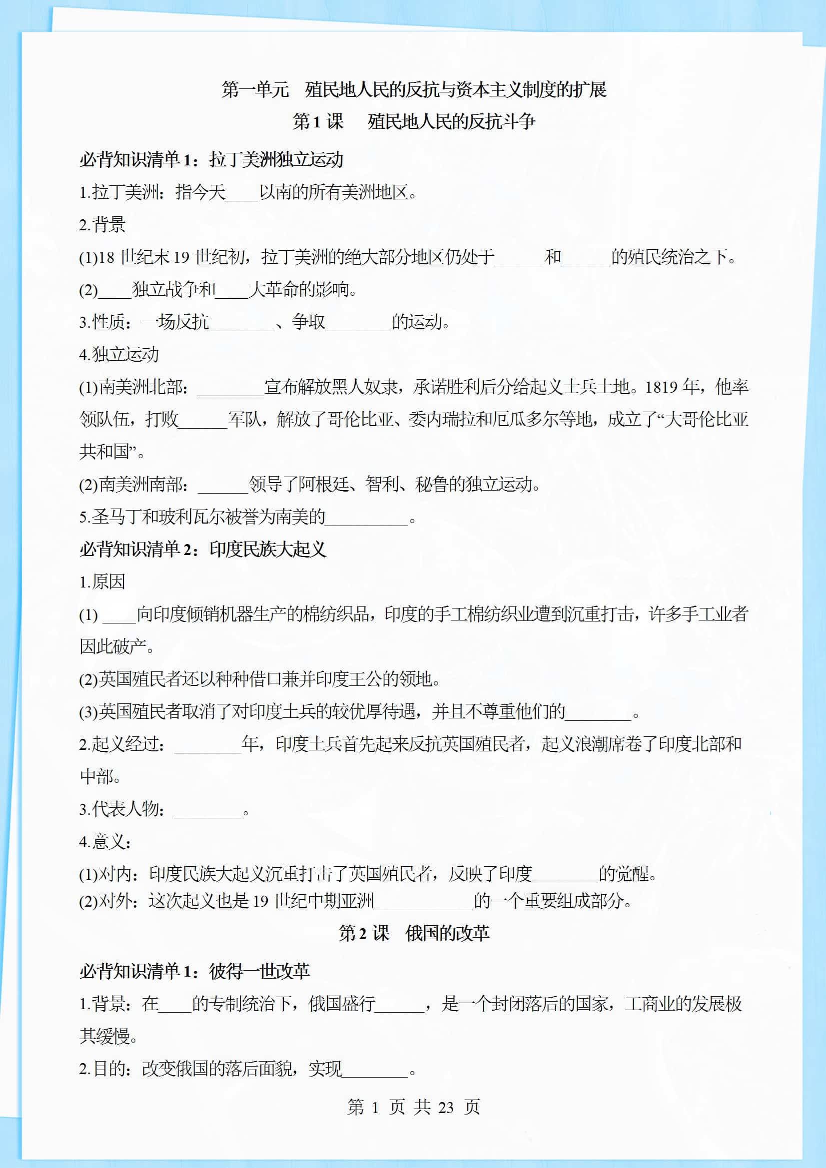 九下历史必背知识清单(填空版)