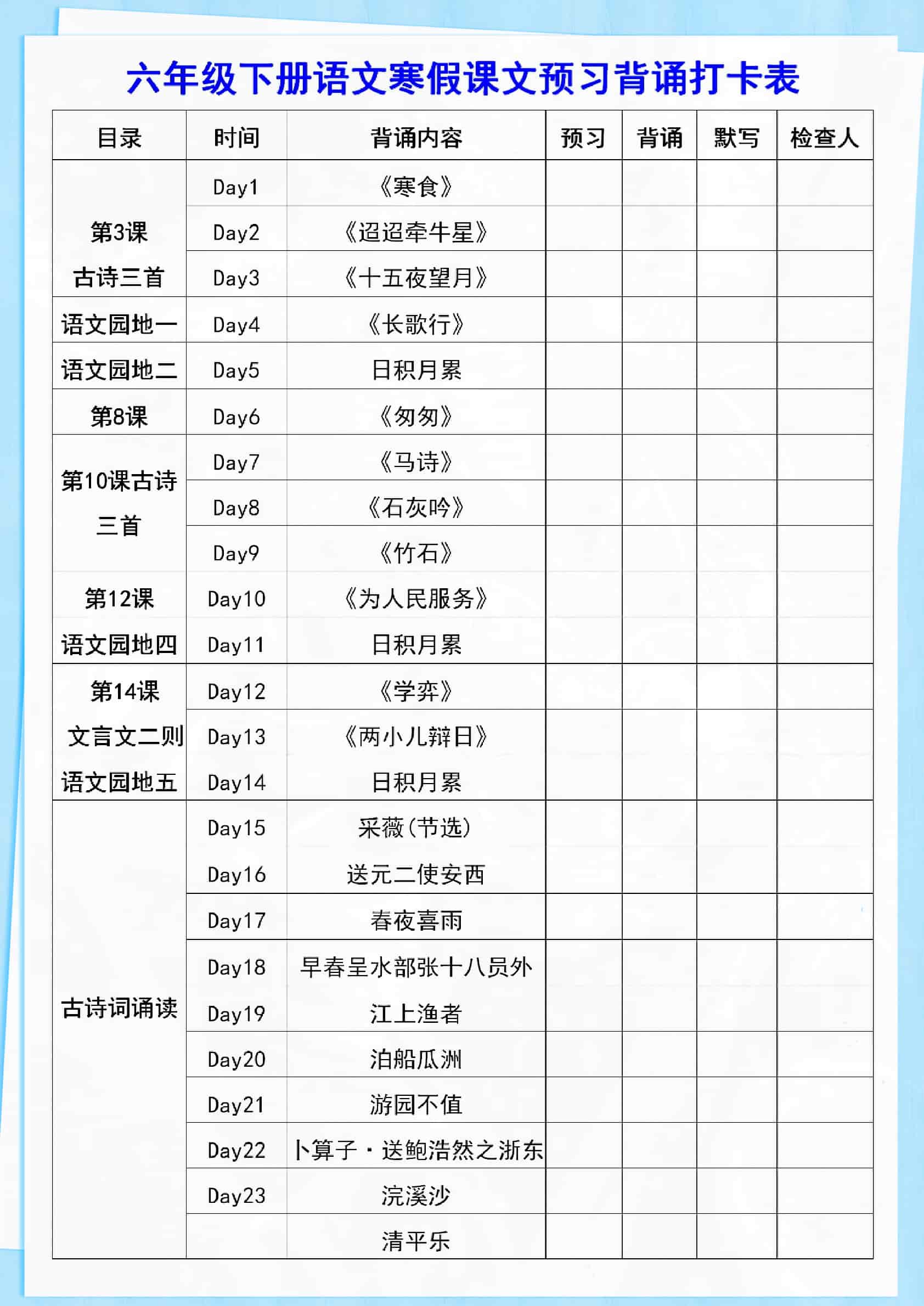 六年级语文【寒假课文背诵资料打卡】六年级语文【寒假课文背诵资料打卡】