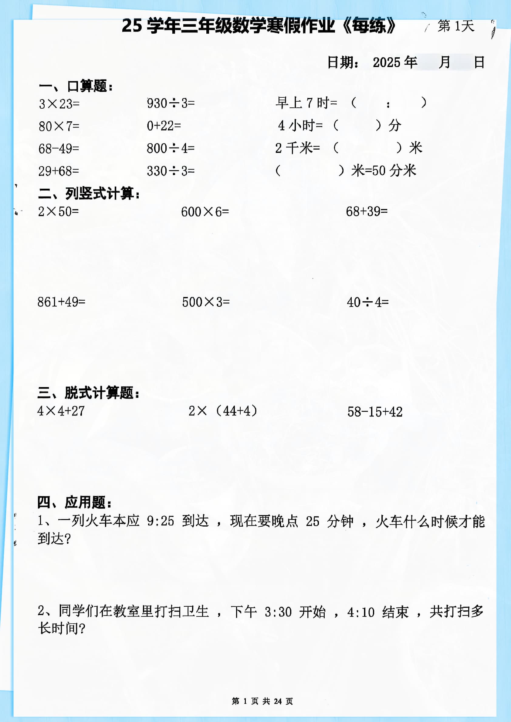 三下数学寒假作业每日一练20天(含答案24页)